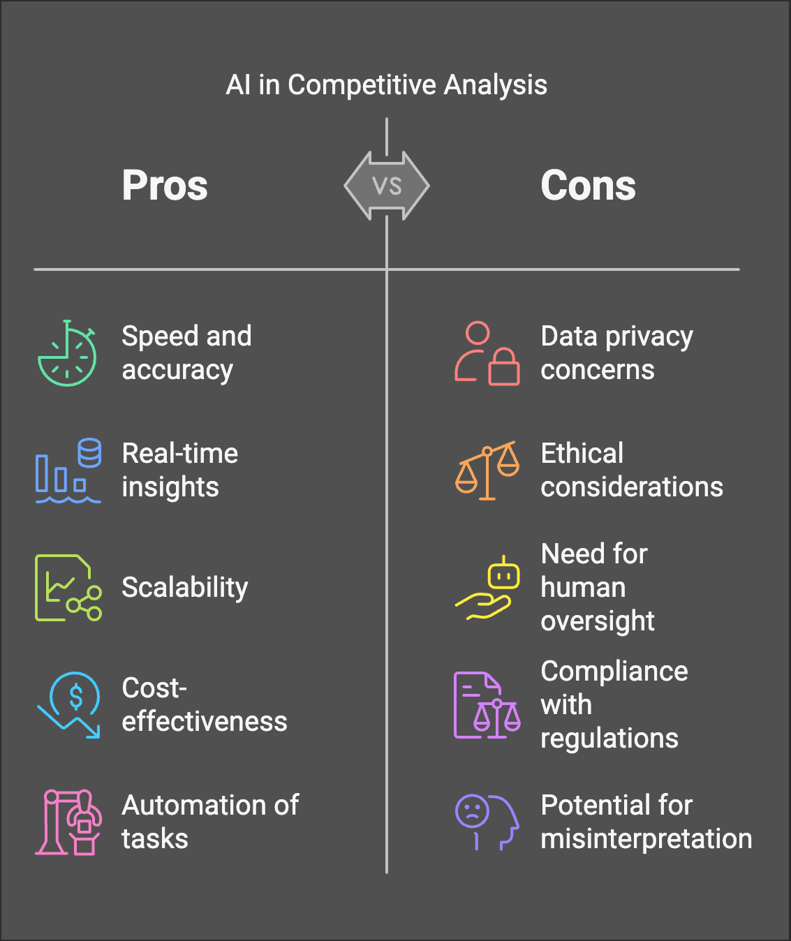 While AI applications in competitive analysis offer significant advantages, they also present unique challenges that businesses must navigate. Understanding both the benefits and potential pitfalls is crucial for effective implementation of AI-driven strategies.